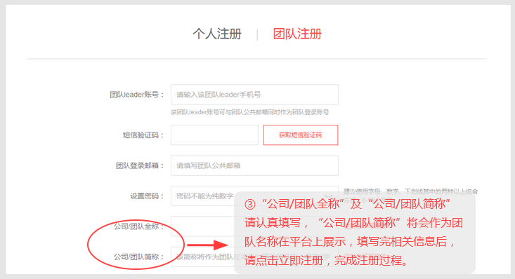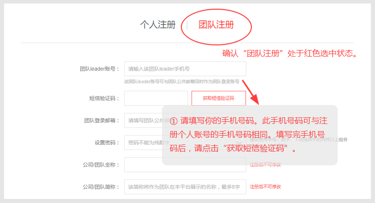 如果你想要组建团队,注册团队之前,你需要首先完成个人账号的注册和实名认证。点击"团队注册",所有信息均为必填项。"团队简称"将作为团队在SMARCH对外展示的名称,注册后不可随意修改,请认真填写。