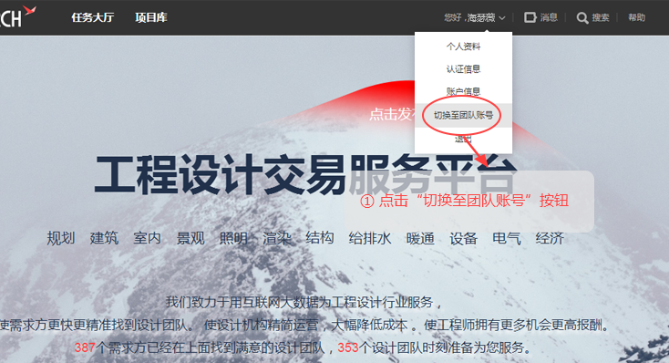 如果你是团队leader并登陆了个人账号,请将鼠标划动至页面的右上角,在用户名下拉列表中,点击 "切换至团队账号" 按钮,就可以从个人账号切换至团队账号,完成登陆。