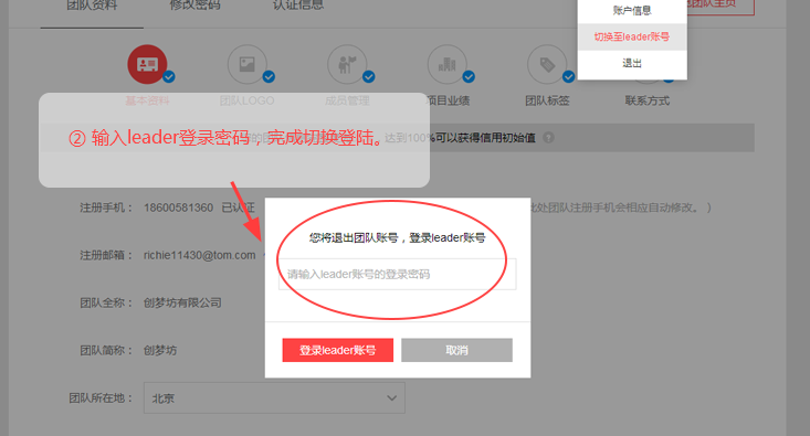 切换成团队账号后,如果想切换回leader个人账号,点击下拉框中的"切换至leader账号"按钮,输入leader登录密码,就可以登录leader个人账号了。